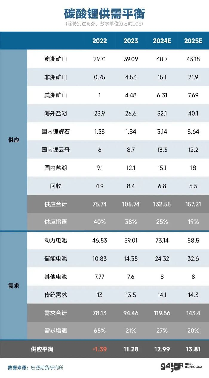 展望2025年,虽然海外多个锂矿项目均放出停减产消息,但综合来看,彻底停产的矿企、锂盐厂数量不多,大多为阶段性停产,且随着盐湖项目投产放量,预计将弥补锂矿方面带来的供给缺口,目前矿端对碳酸锂供给扰动影响有限,全球的锂资源项目及锂盐新增产能放量仍然作为来年碳酸锂供给主旋律。从中长期来看,新能源发展带动下锂盐需求仍具备增长潜力。但关注到库存中下游环节累积较为明显,叠加下游厂商始终对锂采购保持谨慎心态,需求端增速或难抵供给增长预期。根据宏源期货的数据,25年过剩的情况仍将持续。
