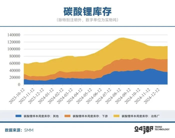 碳酸锂库存累积是行业库存的重要指标,24年以来碳酸锂库存不断累积,在市场对未来供给宽松及锂价下跌预期较为确定的背景下,库存重心大幅上移,前三季度持续处于累库阶段,进入24年四季度有所去库,但仍处于往年同期高位,库存压力仍然较重。