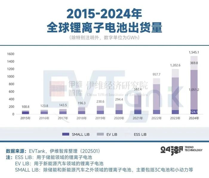 据研究机构EVTank联合伊维经济研究院共同发布的《中国锂离子电池行业发展白皮书(2025年)》显示,2024年全球锂离子电池总体出货量1545.1GWh,同比增长28.5%。从出货结构来看,全球汽车动力电池(EV LIB)出货量为1051.2GWh,同比增长21.5%;储能领域,全球储能电池(ESS LIB)出货量369.8GWh,同比增长64.9%,主要是由于2024年中国新能源强配政策、央国企强化布局及储能成本不断下探,带动ESS保持超高速增长;美国配储刚性需求叠加ITC补贴的效果明显,此外新兴市场多点爆发,2024下半年英国、沙特、澳大利亚等签订多个GWh订单,带动24年储能电池增速可观。
