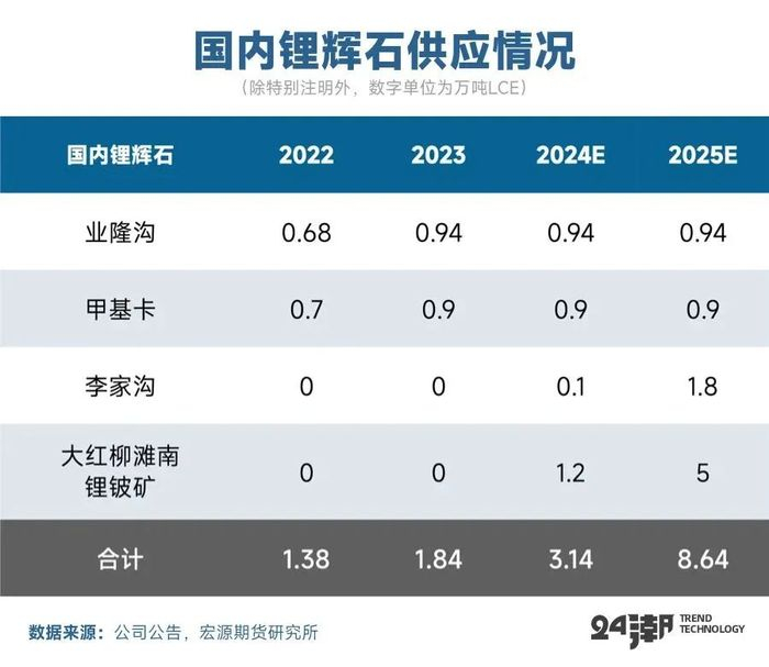 根据各公司公开报告披露,2024年我国在产锂辉石项目主要有业隆沟项目(盛新锂能)、甲基卡矿山(融捷股份)、李家沟矿山(川能动力和雅化集团)以及大红柳滩项目(新疆有色)。其中李家沟矿山及大红柳滩项目为生产主力,预计全年分别贡献1.2万吨LCE。2025年预计两个项目仍有较大幅度的增长。