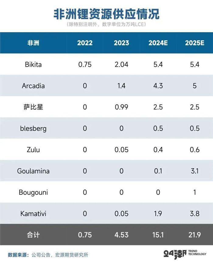 非洲锂矿近年来崭露头角,成为全球锂资源供给中的新兴力量,主要分布在刚果、马里、津巴 布韦和尼日利亚等地,并吸引了大量投资。由中国企业主导开发的Arcadia、Bikita、萨比星等项目在2023-2024年间实现产能释放。赣锋锂业控股的Goulamina项目则于2024年第三季度投产,25年将进一步放量。雅化的Kamativi项目已完成一阶段建设,所产锂精矿已运回国内用于生产,2024年全面完成二阶段建设,25年仍将持续放量。海南矿业的Bougouni项目12月16日在选矿厂举行首次投料试车仪式,标志着该项目正式进入调试阶段,预计将于2025年初实现投产。根据宏源期货的数据,24年非洲锂资源的供应量约为15万吨(折LCE),同比增长233%,25年非洲锂资源的供应量进一步增长至21.9万吨(折LCE),同比增长约45%。