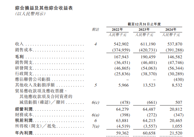招股书显示,在过去的2022年、2023年和2024年,深演智能的营业收入分别为人民币5.43亿、6.11亿和 5.38亿元,相应的净利润分别为人民币5,936.2万、6,065.8万和 2,152.0万元。