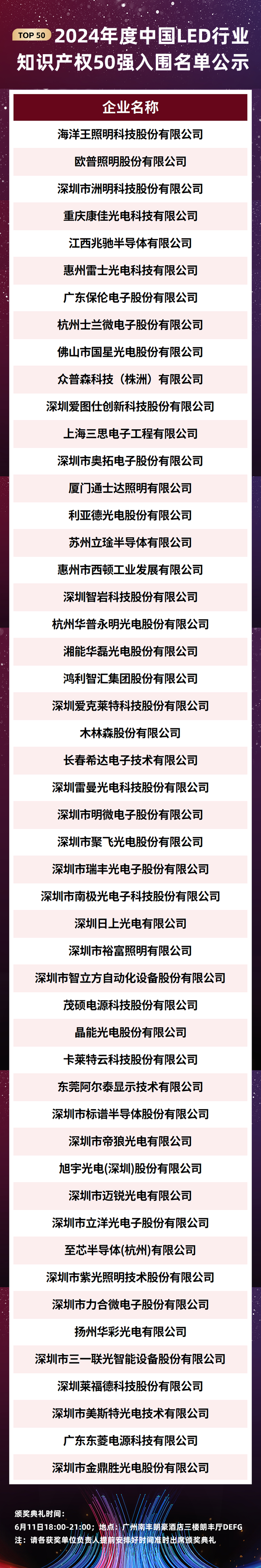 榜单基于企业自主申报,并结合权威机构的专业数据,以企业知识产权的数量、质量及创新效能为核心评价指标,采用科学化评分体系,重点突出企业在技术迭代与市场竞争中的核心优势,最终入围名单已揭晓。组委会将在6月11日于广州南丰朗豪酒店三楼朗丰厅DEFG举办的第十二届中国LED首创奖颁奖典礼上,进行“2024年度中国LED行业知识产权50强”颁奖仪式。