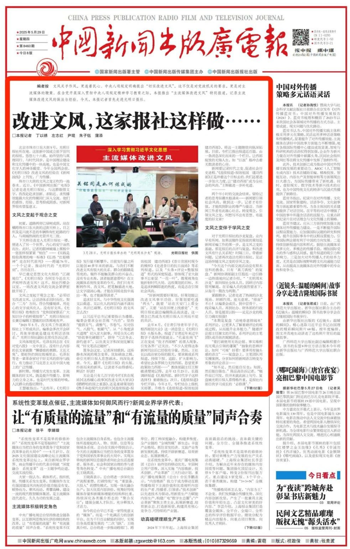 《中国新闻出版广电报》2025年5月29日头版刊发了《改进文风,这家报社这样做……》一文,现全文内容转发如下: