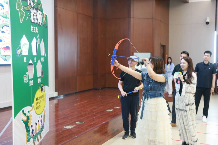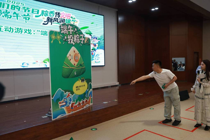 在“端午投粽子”互动环节中,选手们站在规定线外,紧握粽子形沙包,眼神专注瞄准计分区。有人将粽子形的沙包抡出个漂亮弧线,“嗒”地落进内圈。“好!”围观人群爆出喝彩。有的稍有偏差,落在外圈。大家你追我赶,五次机会后,胜出者欢呼雀跃,大家都沉浸在欢乐氛围中。