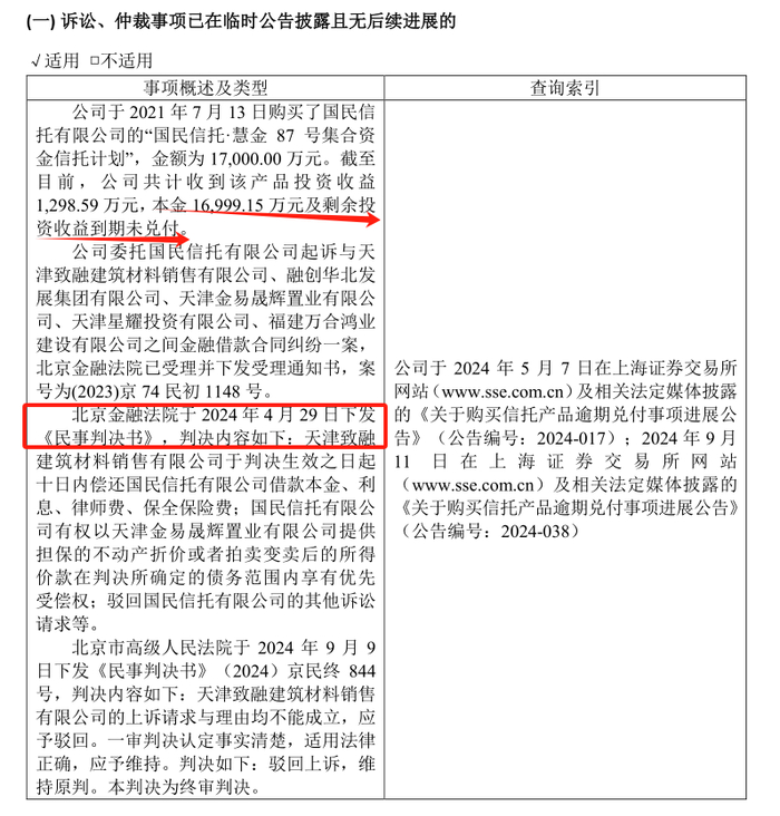 北京市高级人民法院早在2024年9月9日作出终审判决,驳回融资方上诉,维持要求天津致融建筑材料销售有限公司偿还国民信托借款本金2亿元及利息的原判。