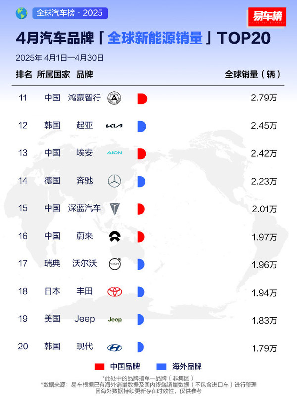 2025年4月全球新能源品牌销量排名:小米成功杀进前十