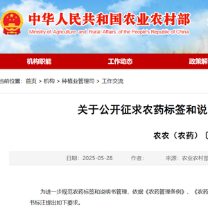5月28日,农业农村部发布了《关于公开征求农药标签和说明书标注要求意见的通知》。