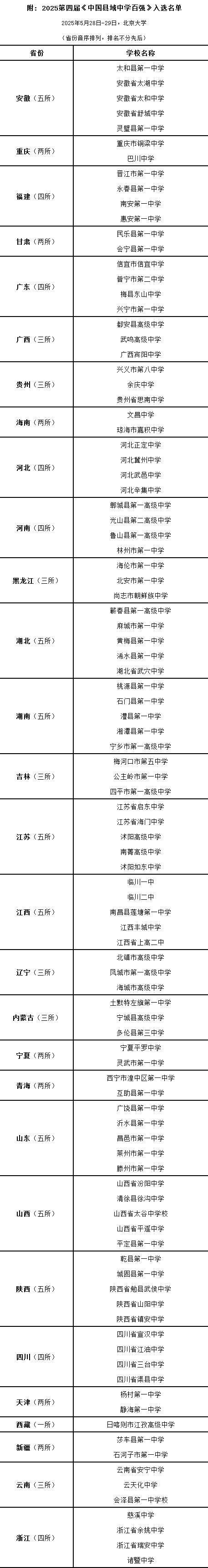 据悉,2025第四届《中国县域中学百强》发布会、颁奖礼于2025年5月28日-29日在北京大学举行,近四十所县域中学与会,同期举行第四届“县域中学北京论坛”。据了解,这是针对中国大陆分布在县级行政区(县及县级市)最好中学的全国性评选活动,两年一届,已经连续三届举办(2019/2021/2023),品牌声誉卓著,引发社会对县域中学的关注。