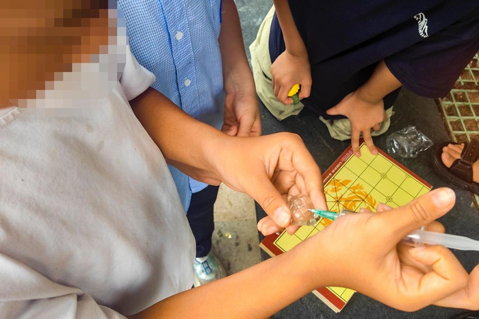 5月27日,一名学生在吉林省某市一小学门口的商店里购买带有注射器和针头的“捏捏乐”。杭州7岁女孩在公园玩耍时