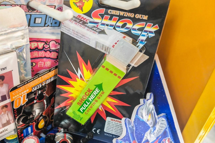 这是5月13日在广西南宁市西乡塘区一小学校外的小卖部里拍摄的具有电击功能的玩具。记者体验后,手臂和手掌有明显的电击麻木感。