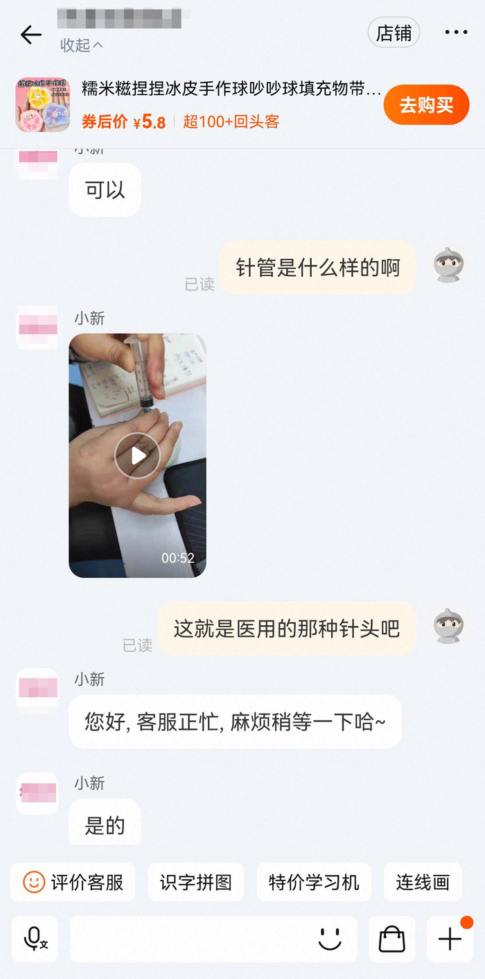 记者与一家销售含有注射器的“捏捏乐”网店客服的聊天记录。