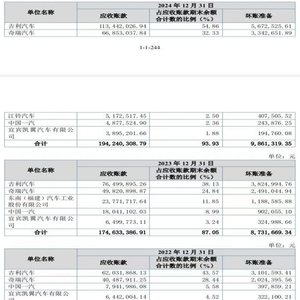为应对坏账风险,吉利汽车加大了坏账准备力度。财报显示,2024年,吉利汽车采用了0.2%至3.1%的平均预期损失率。截至2024年末,吉利汽车的坏账拨备金额为2.51亿元。而在2023年,公司的坏账拨备金额为2.31亿元。