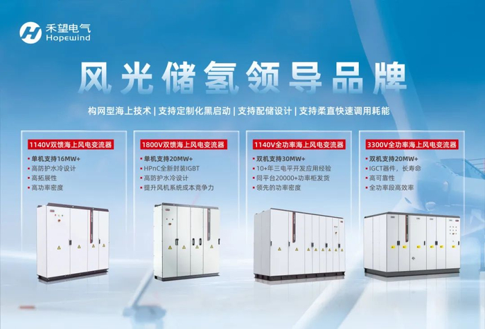 禾望电气依托多年深厚的研发积累,打造了覆盖海上全场景的海上风电变流器产品体系:单机高达16MW+的1140V双馈海上风电变流器,高防护水冷设计与高功率密度,适配深远海严苛环境;采用HPnC全新封装技术IGBT的1800V双馈海上风电变流器, 单机容量高达20MW+,有效提升风机系统成本竞争力;基于10余年三电平技术沉淀及同平台20000+功率柜发货的1140V全功率海上风电变流器,双机支持30MW+容量,功率密度更高;搭载长寿命IGCT器件的3300V全功率海上风电变流器,兼顾高效率与高可靠性,助力平价时代降本增效。