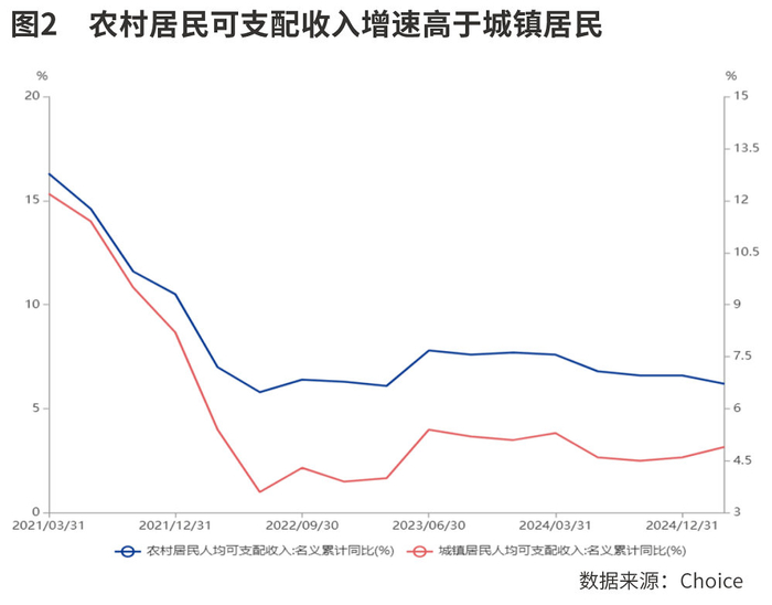由于农村居民收入增长要快于城镇,而且县乡居民的边际消费倾向要高于城镇,叠加政策对中低收入群体的支持,县乡消费的增长潜力得到不断释放。2024年农村居民人均可支配收入(名义)同比增长6.6%,比城镇居民高2个百分点。