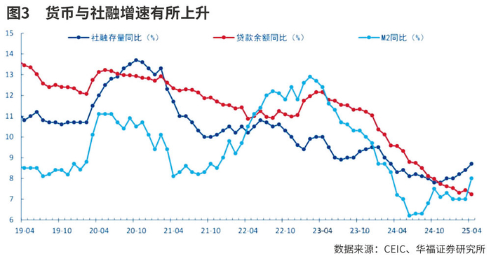 华福证券认为,一方面,年初以来在财政提前发力的推动下广义信用扩张持续加快,带动4月居民和企业存款分别同比少减4600亿元和5428亿元;另一方面,面对美国“对等关税”的初始冲击,中国资本市场展现强大韧性,投资者信心明显提升,大量增量资金入场,非银金融机构存款4月同比多增高达1.90万亿元,成为阶段性显著推升M2的最主要贡献因素。