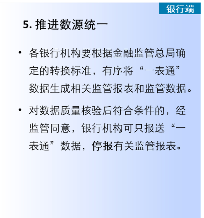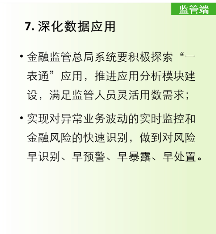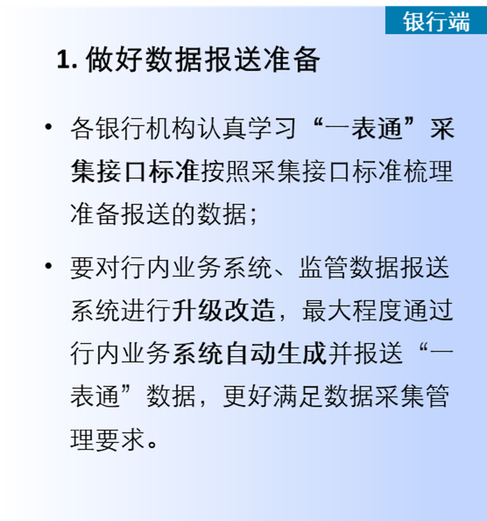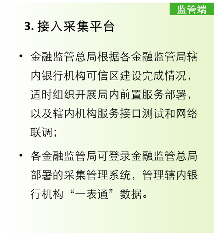 同时也对各监管局和银行机构提出了高度重视“一表通”建设,深刻认识“一表通”工作的重要意义,准确把握和认真组织落实各项工作任务等要求,具体包括“做好数据报送准备、建立监管可信区、推进数据源统一”三项对银行机构的要求、“适配转换工具、完善管理制度”两项对监管端和银行机构共同的要求以及“接入采集平台、深化数据应用”两项对监管端的要求。