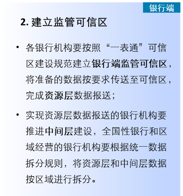 各银行机构的“一表通”数据报送则根据是否为已试点地区以及银行机构的资产规模情况,分2026年6月、2026年底和2027年底等里程碑分批次推进,2027年底前实现全银行业金融机构的报送,当前已参加试点且实现报送的银行要持续开展数据的转换、拆分和验证工作。