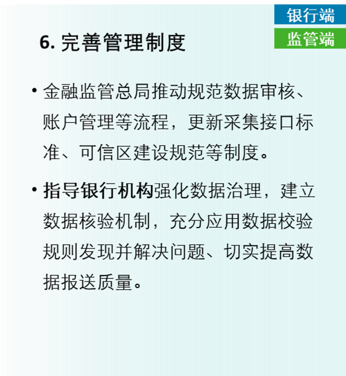 各银行应通过管理办法、核心流程、原则建立、配套考核要求等完善数据确权、数据质量闭环管理、数据需求管理、新产品和新业务管理、指标同源等,持续推动行内监管数据治理文化搭建和管理体系的完善,为高质量的监管数据提供保障。