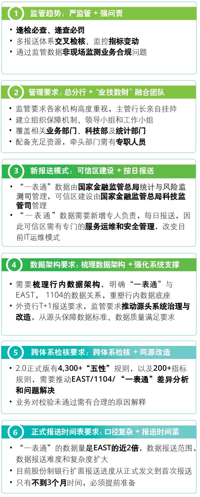 当前“一表通2.0正式版”已在全部国有大行和全国性股份制商业银行全面推广,并在浙江、上海、福建、江苏、辽宁、四川、重庆、河北、江西、山东、广东等多个省市监管局下辖外资机构和区域性银行进行试点,已形成了“一表通”工作基本框架。本次发文旨在通知总局系统和银行机构“全面推进开展‘一表通’工作”的决定。各监管局需在6月10日和9月底前分别向总局报送辖区银行的“一表通”数据报送计划表、“一表通”总体方案,并按半年度报送工作进展。
