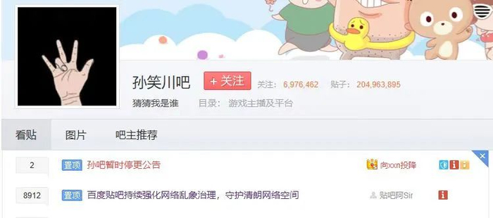 5月29日,百度贴吧的孙笑川吧置顶了暂时停更公告,公告显示“因平台管理需求升级,孙笑川吧于5月29日到6月12日暂时停更15天,届时孙笑川吧将只能浏览,不能发贴。”孙笑川吧同时置顶了百度贴吧站方《持续强化网络乱象治理,守护清朗网络空间》的文章,文章表示百度贴吧启动为期一年的专项整治行动,重点整治色情低俗乱象、涉未成年有害行为、侵犯公民个人隐私行为,并持续针对饭圈引战、极端性别对立、虐待动物、自杀自残行为、网络水军等多版块内容进行严格管控。
