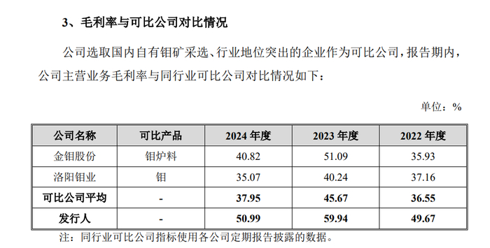 对此,盛龙股份解释称,毛利率较金钼股份高,主要系相较公司将钼精矿作为主要产品,金钼股份存在采购钼精矿进一步加工成焙烧钼精矿、钼铁的情形,加工环节整体毛利率较低。公司毛利率较洛阳钼业高,一方面系洛阳钼业钼铁销量占比较高,另一方面系矿山整体开采阶段不同,公司矿山已开采年限较短,开采深度较浅,综合开采成本低,毛利率较高。
