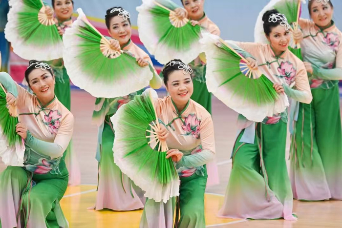 尤为引人注目的是新疆维吾尔自治区老体协代表队的表演。他们手持粉扇,面含微笑,以一首《花儿美》的回族曲目,展现了回族舞蹈的独特魅力。“在团队在舞蹈编排上,将健身秧歌规定的基本步伐与回族舞蹈风格深度融合,既展现力量感又融入柔美韵律,表达了各族人民对美好生活的热爱。” 领队彭琪说。