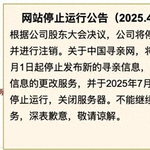 记者在中国寻亲网首页看到,网站停止运行公告是2025年4月1日发布的,内容为:“根据公司股东大会决议,公司将停止全部业务并进行注销。关于中国寻亲网,将于2025年5月1日起停止发布新的寻亲信息,仅提供原有信息的更改服务,并于2025年7月15日起网站停止运行,关闭服务器。不能继续为大家服务,深表歉意,敬请谅解。”