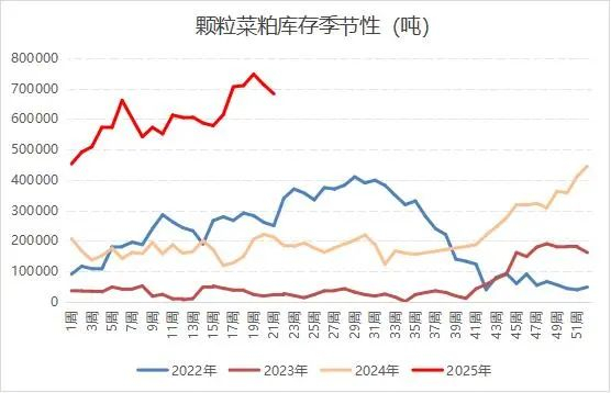 尽管中国对加拿大菜粕加征100%关税,但去年以来油厂压榨利润较高,油菜籽进口量也偏高,国内进口菜粕库存量一直处于历史高位。尽管适逢水产养殖旺季,菜粕需求量有所提高,近两周来进口颗粒粕库存有所缩减,但仍处于历史同期最高位置。
