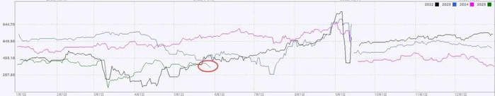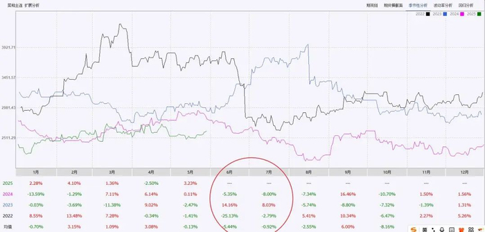 从菜粕主力合约季节性分析来看,近三年6-7月菜粕价格更倾向于下跌。其中2023年夏季,由于加拿大草原省遭遇干旱天气,引发市场对全球菜籽减产的担忧,菜系进口成本走高带动国内菜粕期货大幅上涨。