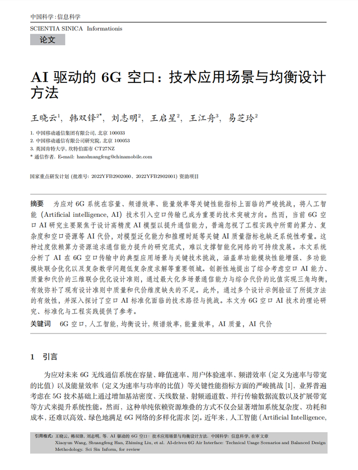 中国移动研究院6G空口AI 技术论文在国内顶级学术期刊《中国科学:信息科学》发表