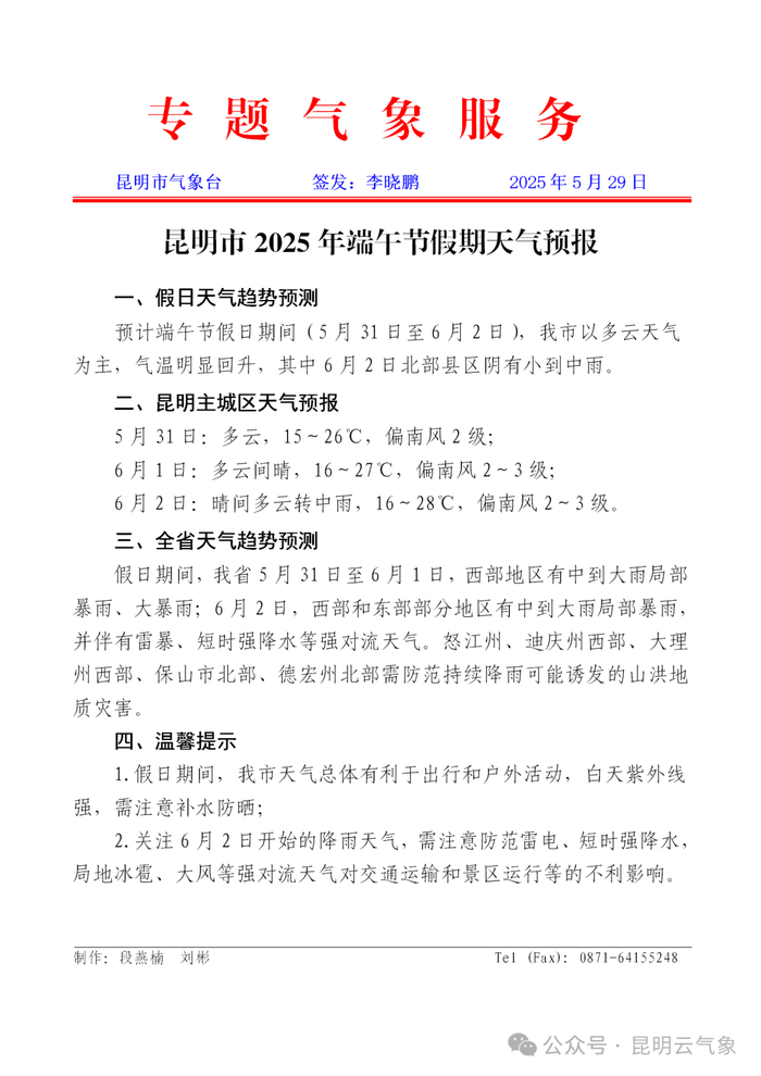 昆明端午节假期天气预报