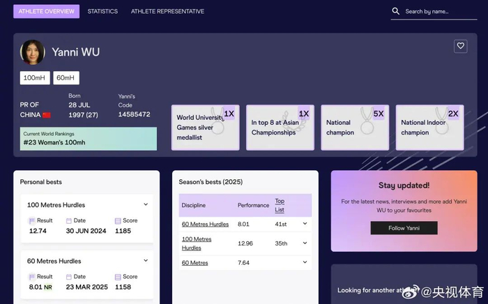 吴艳妮,1997年7月出生于四川自贡市富顺县,中国女子田径运动员,主攻女子100米栏,效力于四川田径队和中国国家田径队。在2024年巴黎奥运会上,吴艳妮以12秒97的成绩刷新了中国女子100米栏奥运会最佳成绩。今年3月,吴艳妮在2025年南京世界田联室内锦标赛女子60米栏半决赛中,以8秒01的成绩创造了新的全国纪录。