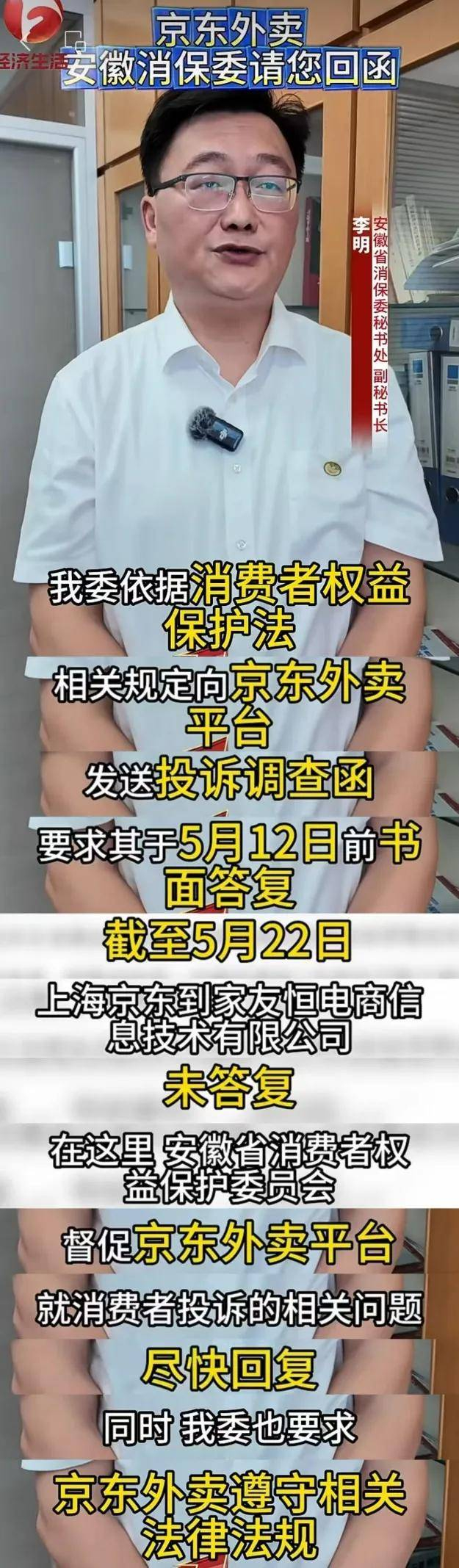 同日,据媒体报道,安徽省消保委近期前往合肥部分京东外卖店铺实地调查,发现实际环境脏乱差,没有堂食场所,与线上环境图片以及“堂食餐厅”标签不符。对此,安徽省消保委秘书处副秘书长李明表示,近期消保委收到多起消费者投诉,反映京东外卖平台商家通过上传不实图片虚构品质堂食,平台方对商家信息审核不严,形成了一定消费落差。