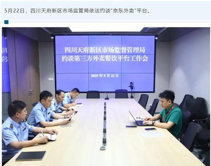 例如,5月22日,四川天府新区市场监督管理局就约谈了京东外卖平台,指出平台存在部分商家在平台公示的经营场所图片与线下门店实际不符、部分商家超范围经营、部分商家存在低价低质竞争扰乱市场秩序等问题。