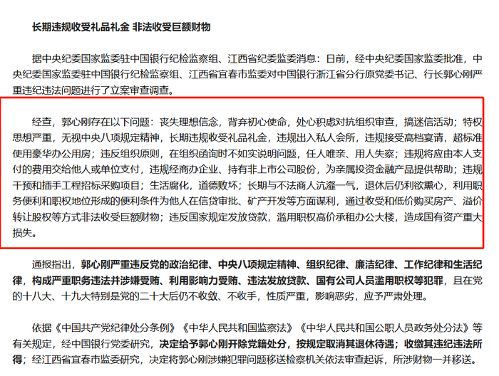 根据12月通报,郭心刚违规经商办企业、持有非上市公司股份,为亲属投资金融产品提供帮助;生活腐化,道德败坏;长期与不法商人沆瀣一气,退休后仍利欲熏心,利用职务便利为他人在信贷审批、矿产开发等方面谋利,通过收受和低价购买房产、溢价转让股权等方式非法收受巨额财物;违反国家规定发放贷款等。