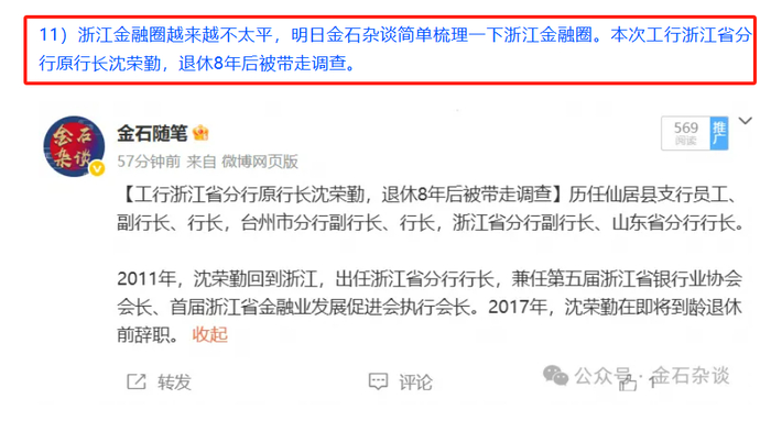 5月28日凌晨,金石杂谈报道,浙江金融圈不太平,本次工行浙江省分行原行长沈荣勤,退休8年后被带走调查。不曾想29日凌晨忘记写了,被其他媒体捷足先登了,那就今天补上。