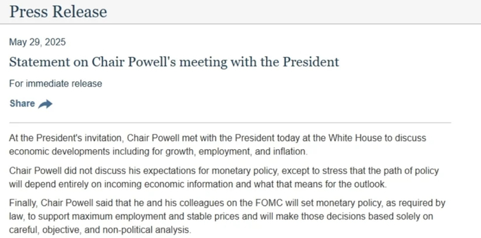 5月30日,据美联储官方公告,应美国总统邀请,美联储主席鲍威尔今日在白宫会见特朗普,讨论经济发展相关问题,包括经济增长、就业和通胀等议题。