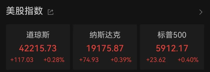 从市场表现来看,道指涨117.03点,涨幅为0.28%,报42215.73点;纳指涨74.93点,涨幅为0.39%,报19175.87点;标普500指数涨23.62点,涨幅为0.40%,报5912.17点。