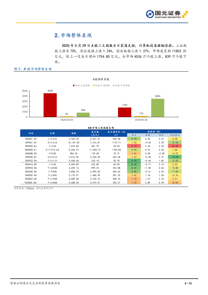 2025年5月29日A股三大指数全日震荡走强,计算机设备涨幅居前。上证指数上涨0.70%,深证成指上涨1.24%,创业板指上涨1.37%。市场成交额11852.31亿元,较上一交易日增加1754.80亿元。全市场4536只个股上涨,839只个股下跌。