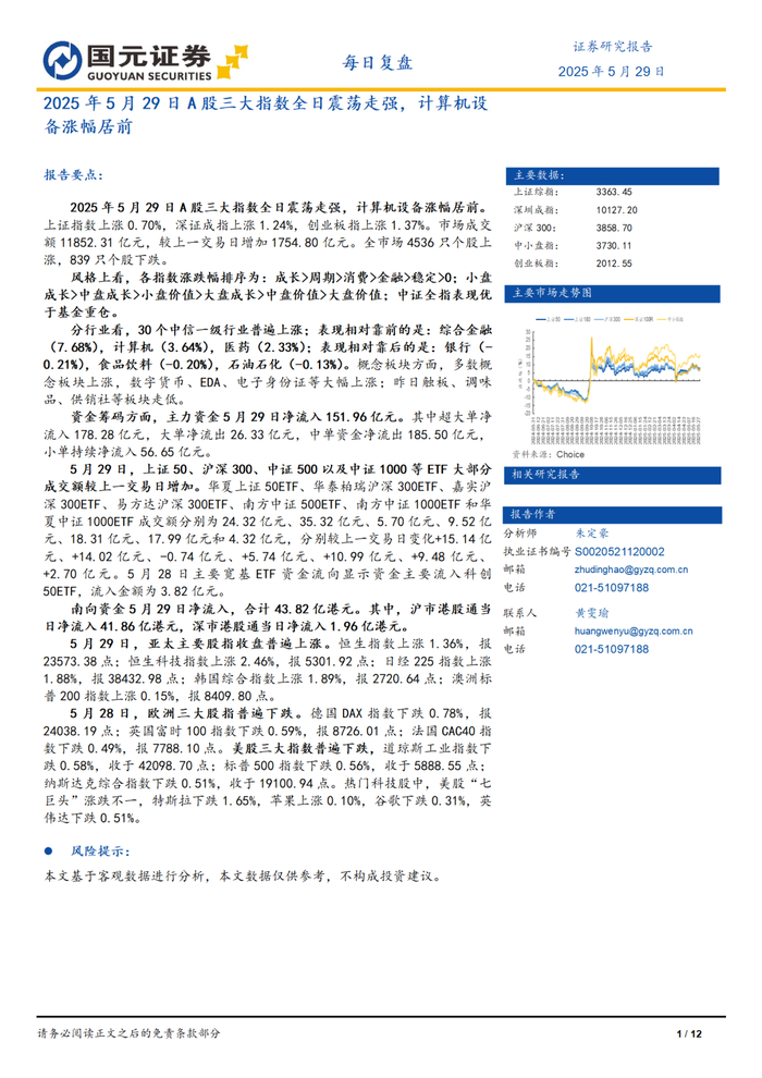 本报告摘自国元证券2025年5月29日已发布的《2025年5月29日A股三大指数全日震荡走强,计算机设备涨幅居前》查看原文,具体报告及分析内容请详见报告。若因对报告的摘编等产生歧义,应以报告发布当日的完整内容为准。
