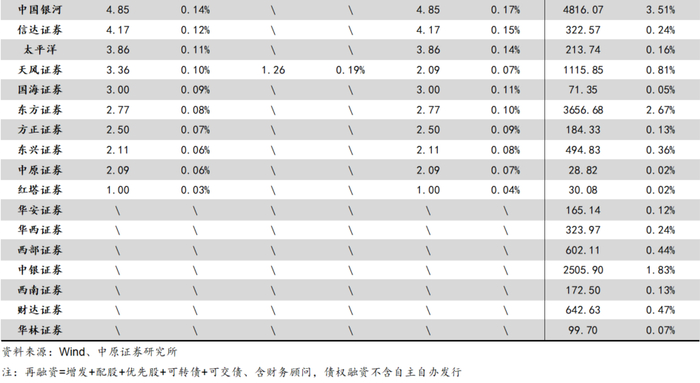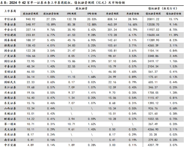 股权融资业务方面,根据Wind的数据进行统计,2024年股权融资承销金额排名前5(CR5)上市券商的合计市场份额为65.10%,同比+6.81pct,再创历史新高;前10(CR10)上市券商的合计市场份额为79.25%,同比+2.35pct,同步再创历史新高。上市券商中,中信证券(27.23%)、华泰证券(15.89%)、中金公司(9.76%)、中信建投(6.77%)、国泰海通(5.45%)排名股权融资规模前5位;中信证券(20.03%)、华泰证券(12.88%)、中信建投(9.28%)、国泰海通(6.90%)、中金公司(5.42%)排名IPO规模前5位;中信证券(28.94%)、华泰证券(16.60%)、中金公司(10.79%)、中信建投(6.17%)、国泰海通(5.11%)排名再融资规模前5位。2025Q1股权融资规模CR5的合计市场份额为64.31%,较2024年微幅下降;CR10的合计市场份额为82.89%,较2024年进一步提高。