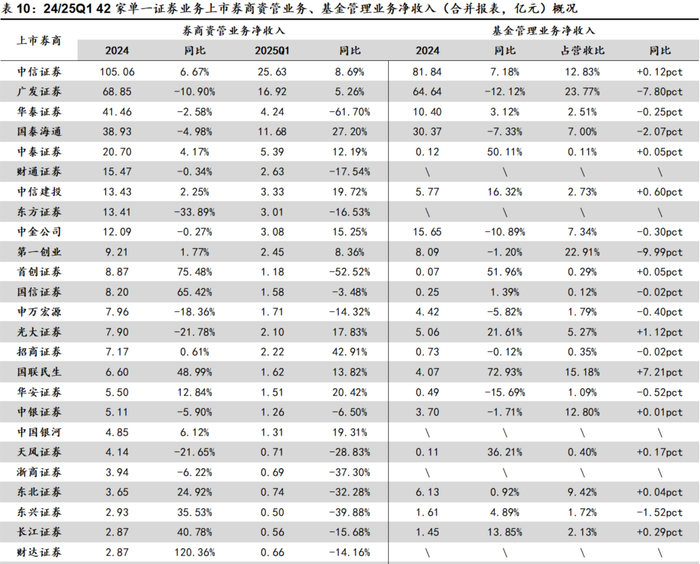 2025年一季度42家单一证券业务上市券商共实现合并口径资管业务手续费净收入101.31元,同比-3.32%。共19家公司同比实现正增长,共20家公司同比表现优于上市券商均值,占比47.6%。25Q1资管业务成为上市券商唯一出现下滑的主营业务,预计主要由于一是固收市场明显走弱,超额业绩报酬同比出现明显下滑;二是公募费改对资管业务的影响持续存在。