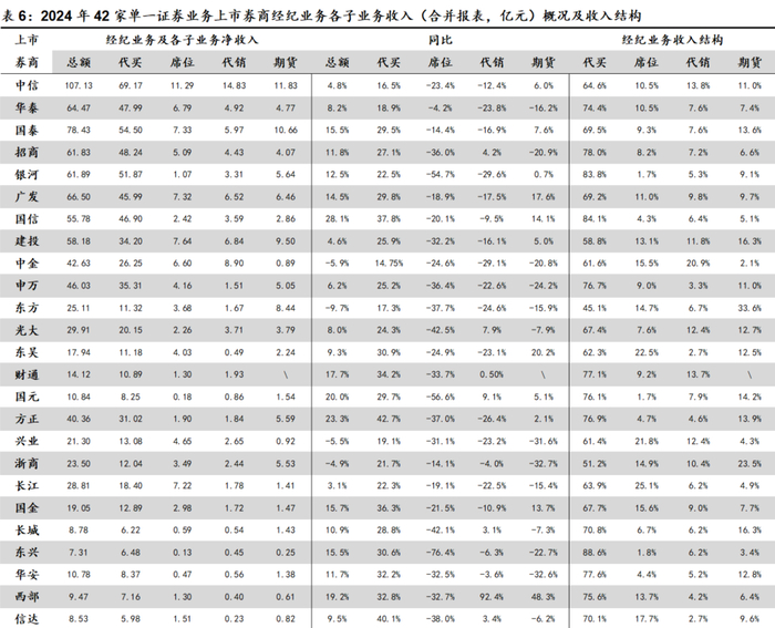 根据各公司合并财务报表,2024年42家单一证券业务上市券商共实现合并口径经纪业务手续费净收入1061.29亿元,同比+9.64%,在连续两年下滑后止跌回升。其中,截至24Q3上市券商经纪业务手续费净收入同比-13.58%,连续第三年下滑且降幅进一步扩大,但得益于第四季度权益市场显著回暖,2024年全年上市券商经纪业务手续费净收入最终转为小幅回升,行业经纪业务实现困境反转。上市券商经纪业务各子业务领域中,代理买卖证券业务、交易单元席位租赁、代销金融产品业务、期货经纪业务合计净收入分别为751.99亿元、112.93亿元、88.65亿元、107.70亿元,同比分别+26.10%、-25.90%、-16.40%、-4.80%;在经纪业务手续费净收入中的占比分别为70.90%、10.60%、8.40%、10.10%,同比分别+9.20pct、-5.30pct、-2.40pct、-1.50pct。