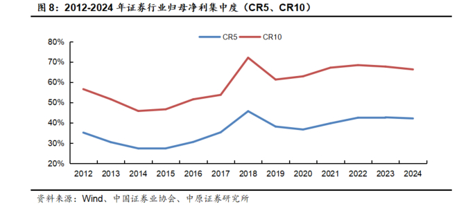 2024年排名行业前5位(CR5)、前10位(CR10)证券公司归母净利的集中度分别为42.12%、66.29%,同比分别-0.54个百分点、-1.38个百分点。2024年排名行业前5位、前10位证券公司的归母净利合计分别为704.56亿元、1108.77亿元,同比分别+19.82%、+18.87%,但集中度均有所回落。整体看,2024年行业归母净利集中度维持在近十年来的次高位水平,一是头部券商、特别是龙头类券商受益于培育一流投资银行,各项业务开展的广度及深度得到持续拓展,业绩稳定性持续增强,推动归母净利CR5集中度持续高位运行。二是2024年中小券商普遍实现了较为理想的投资收益(含公允价值变动),叠加零售经纪业务于四季度实现困境反转,共同推动中小券商整体经营业绩改善的幅度优于头部券商,进而导致归母净利CR10集中度下降的幅度大于CR5。