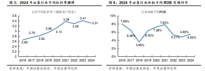 根据中国证券业协会公布的行业数据进行计算,剔除客户交易结算资金余额后,2024年证券行业平均杠杆率为3.31倍,同比微幅下降,杠杆率维持在2021年以来的相对高位区间窄幅震荡,近年来行业扩表速度持续放缓。2024年行业加权平均净资产收益率为5.50%,同比+0.70个百分点,在2022-2023年连续两年回落后实现回升。