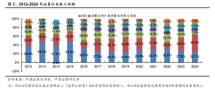 根据中国证券业协会公布的行业数据进行统计,2024年行业经纪、自营、投行、资管、利息、其他净收入占比分别为26.7%、38.6%、7.8%、5.3%、11.1%、10.5%,2023年行业经纪、自营、投行、资管、利息、其他净收入占比分别为27.8%、30.0%、13.4%、5.5%、13.1%、10.2%。