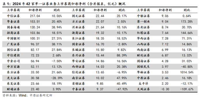 归母净利增速方面,2024年42家单一证券业务上市券商共34家实现增长,同比+4家,仅8家公司同比出现下滑。其中,增速前5位分别为华林证券(1014.54%)、第一创业(173.28%)、红塔证券(144.66%)、东兴证券(88.39%)、华西证券(71.31%);增速后5位分别为天风证券(-109.67%)、中泰证券(-47.92%)、国联民生(-40.80%)、光大证券(-28.39%)、太平洋(-12.17%)。