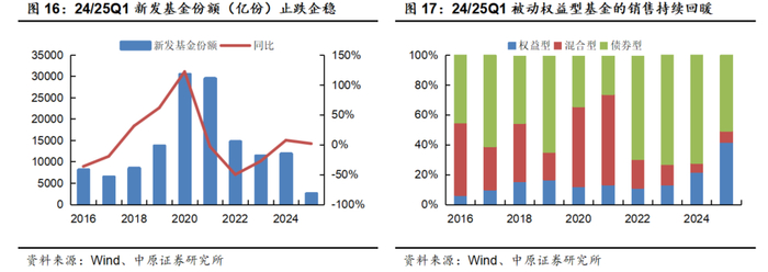 截至25Q1剔除货币市场基金后的公募基金、股票+混合公募基金净值分别为18.89万亿元、8.05万亿元,较2024年底分别-1.72%、+1.13%。得益于被动权益型基金新发规模与净申购规模的同步增长,叠加权益市场的明显修复,24/25Q1权益类公募基金的保有规模企稳回升。