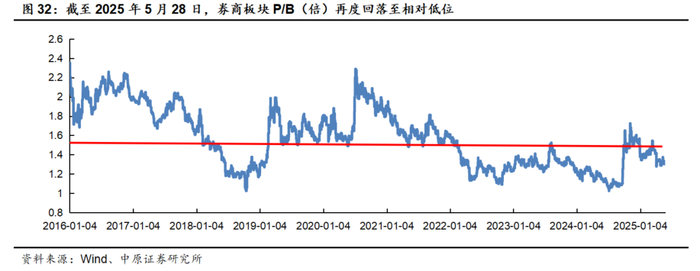2025年以来券商指数逐级震荡回落,持续处于震荡整固周期。截至5月28日,年内券商板块平均P/B最高为1.544倍,最低为1.278倍,整体运行区间持续处于2016年以来券商板块1.55倍的平均P/B(图32中红线)以下。特别是二季度以来,券商板块的平均P/B集中在1.30倍-1.40倍的区间内波动,再度拉开了与2016年以来板块平均估值的距离,并回落至相对低位。